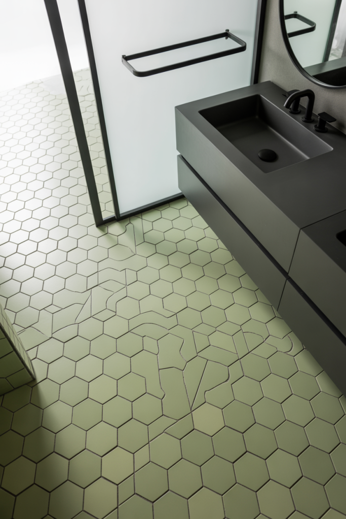 A pale mint tone with hexagonal floor tiles creates an ambiance on the floors that’s not only fun but also very artistic because of its geometric principle of creation. A contractor told me that house owners appreciate these designs on floors because the designs create an ambiance on the floor that’s “fun but still grown-up.” This works well because the addition of the pale green tone on the floor creates the ambiance of being gentle even if the floor’s geometric pattern on the floor principle creates an artistic ambiance on the floors of the bath area. This works well on new constructions and renovation projects.