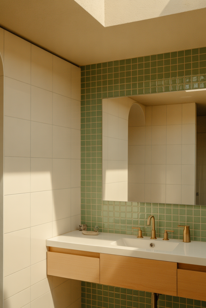 One of the mistakes people make is using bold color everywhere. Keeping green to one surface makes the bathroom feel less visually cluttered and more grounded.