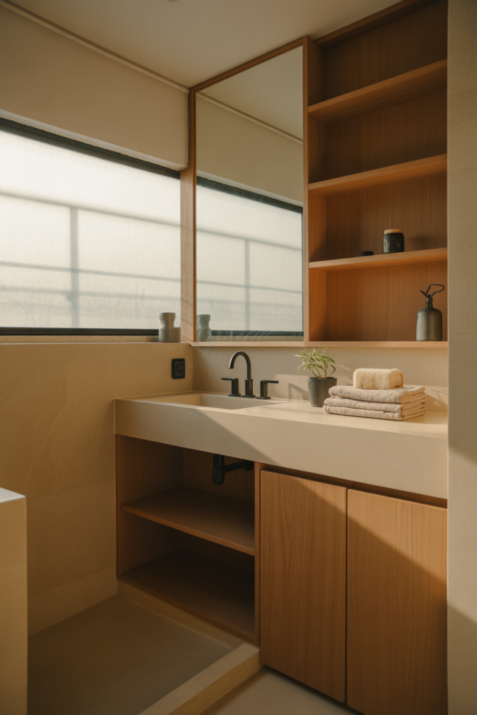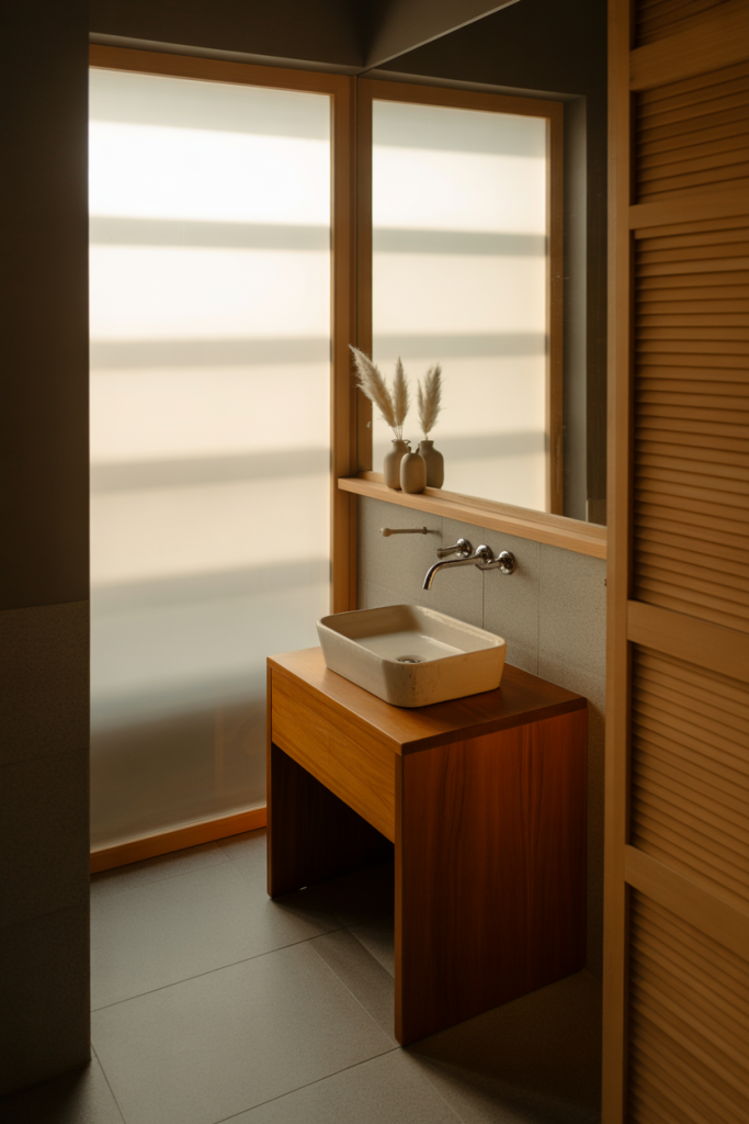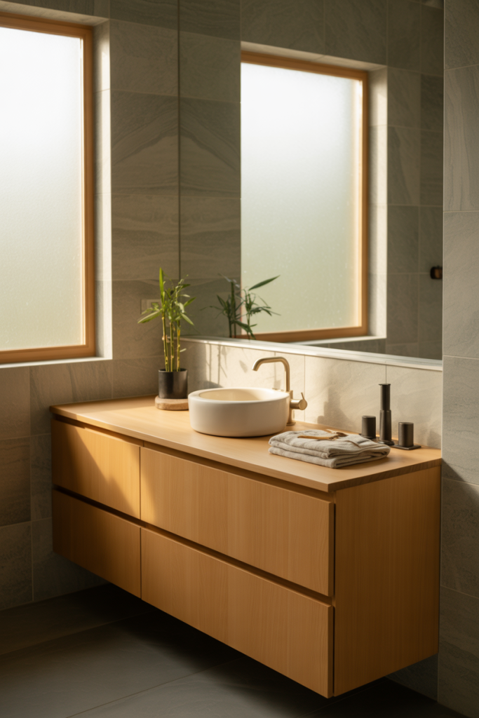 Japandi has and still is influencing small bathroom design in 2026 for the better with its blending of Japanese and Scandinavian elements. The combination of natural wood, smooth stone, and muted color captures a subtle, peaceful spa environment. The style thrives on simplicity and intention rather than decoration.