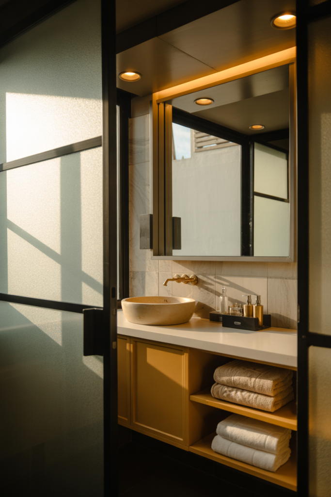 Borrowing cues from boutique hotels, this small bathroom design 2026 idea leans into luxury through lighting and materials rather than size. Layered light, plush textures, and refined finishes make the space feel special without excess.