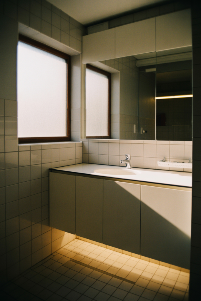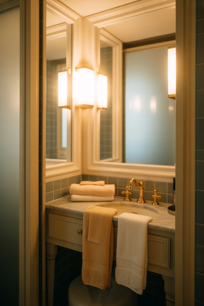 The practical takeaway is lighting placement. Vertical lights at mirror height reduce shadows and make small bathrooms more functional for real routines like shaving or makeup.