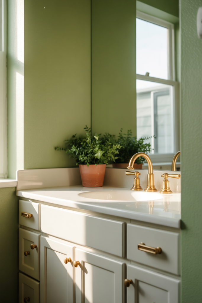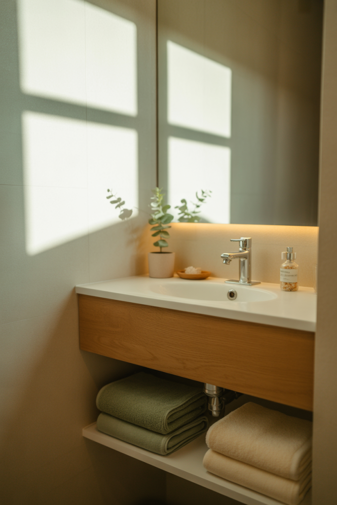 Adding green tones brings life to Small Bathroom Design 2026. Whether through tile, paint, or plants, this inspiration feels especially modern and grounding. Soft sage or olive pairs beautifully with white fixtures and warm metals, creating a space that feels relaxed rather than styled.