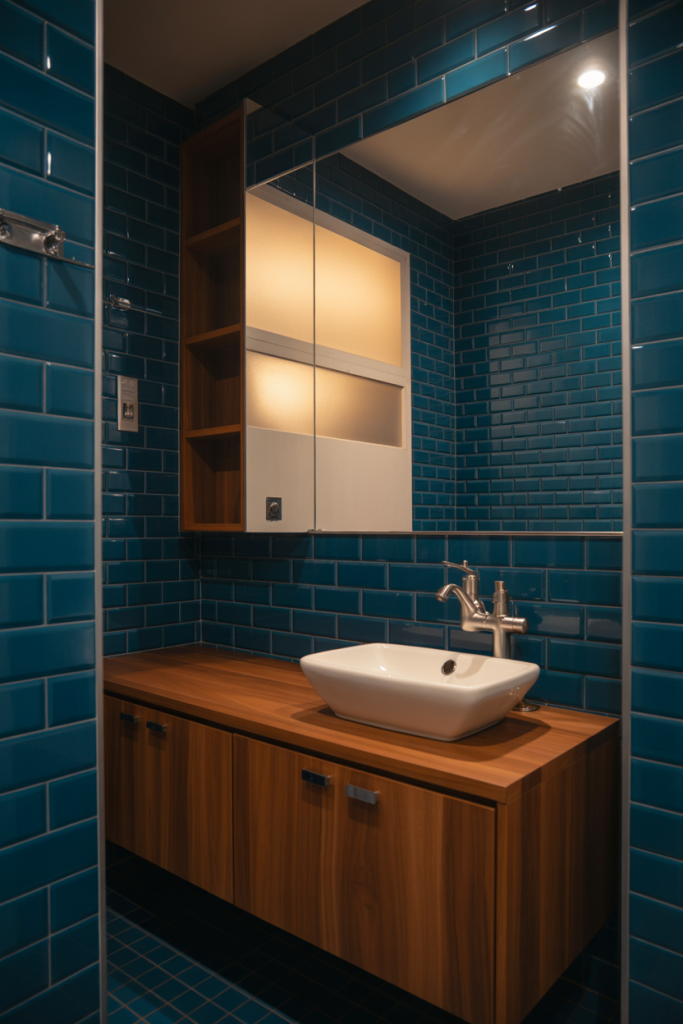 Small bathroom design in 2026 certainly continues the trend of using blue colors, particularly in the deeper shades and paired with the modern luxurious finishes. Dusty blue or navy tiles, paired with modern finishes, look refined and sophisticated. This design aesthetic is ideal for contributing a bolder and more memorable design to a small bathroom.