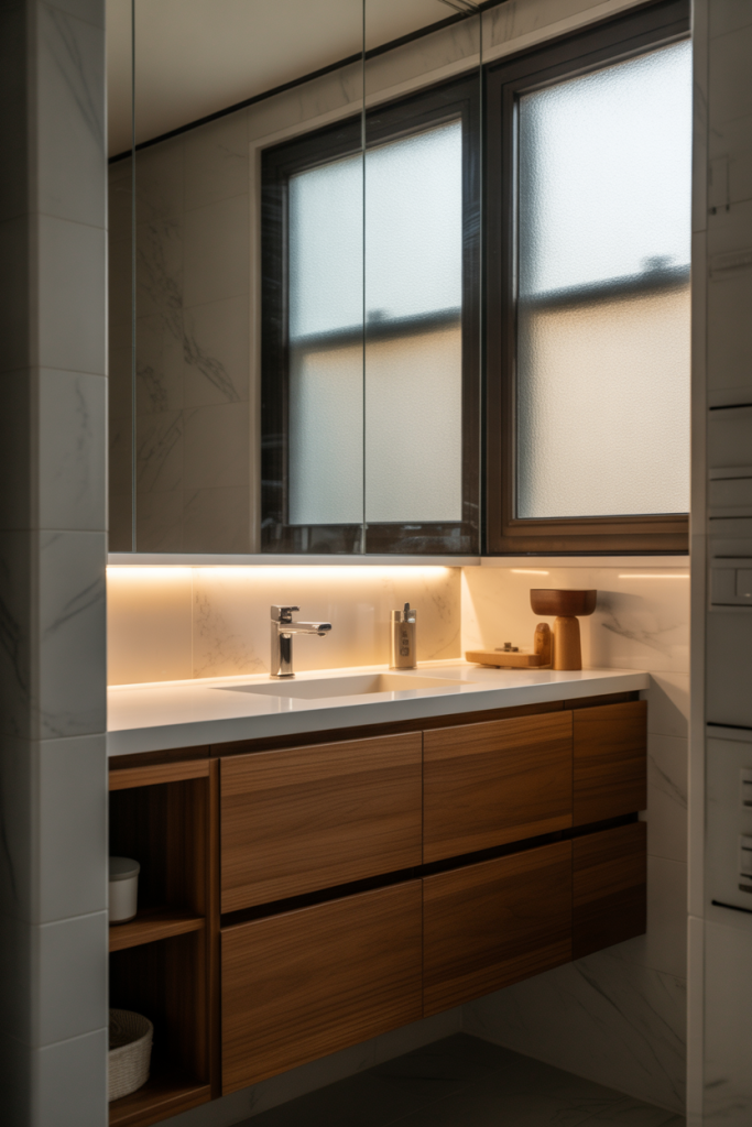 A practical insight here is scale control. Oversized tiles and fixtures can visually expand tight rooms when used consistently. The mistake many make is mixing too many finishes, which breaks the illusion of space and makes even luxury feel cluttered.