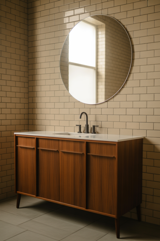 The influence of Mid century design returns in a quieter, more refined way for modern bathrooms. Warm wood tones meet crisp tile, while subtle Contemporary lines keep the look fresh. This style bridges old and new, offering nostalgia without feeling dated and structure without losing warmth.