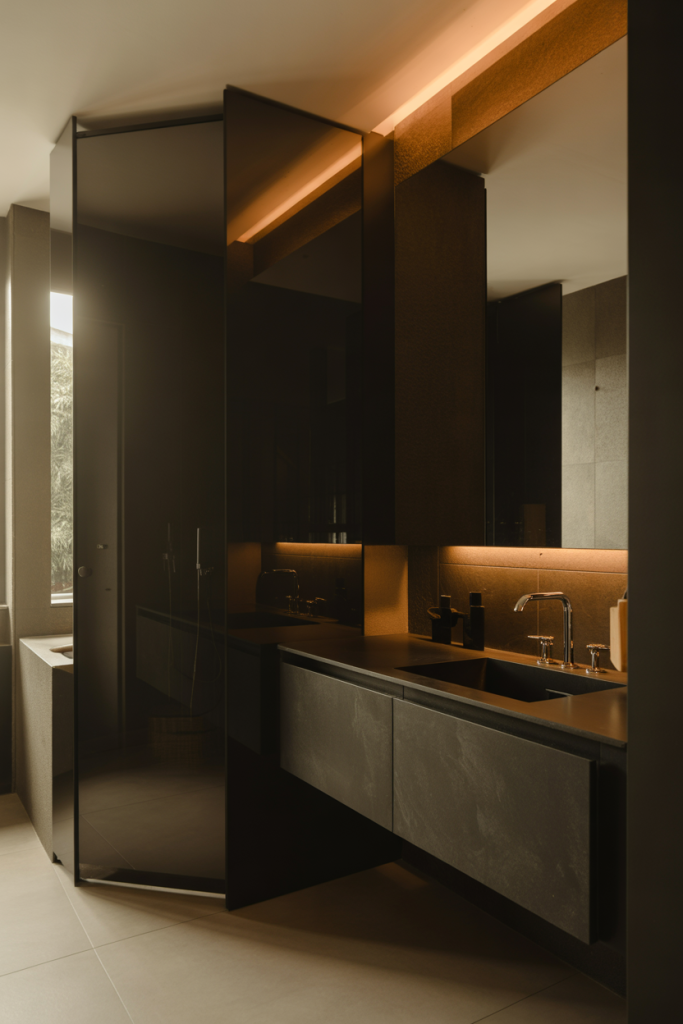 Dark bathrooms are no longer intimidating when balanced correctly. Using Dark tones alongside modern lighting and reflective surfaces transforms the Bath into a bold yet inviting space. The mood feels intimate, not closed off.