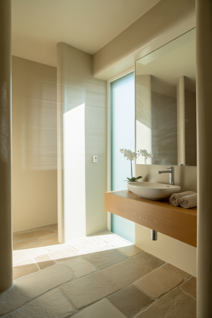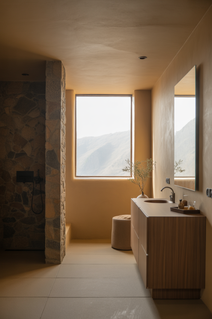 Minimalism feels warmer when guided by earthy tones and natural finishes. This style of the bathroom preserves comfort and strips away excess with a balance of texture and color.