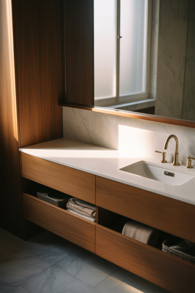 From a practical standpoint, this approach works best when storage is built vertically rather than spread out. Wall-mounted vanities and recessed shelving keep the floor visually clear, which makes the entire space feel calmer. The key insight here is restraint: fewer materials, repeated thoughtfully, deliver a sense of luxury that feels intentional instead of crowded.