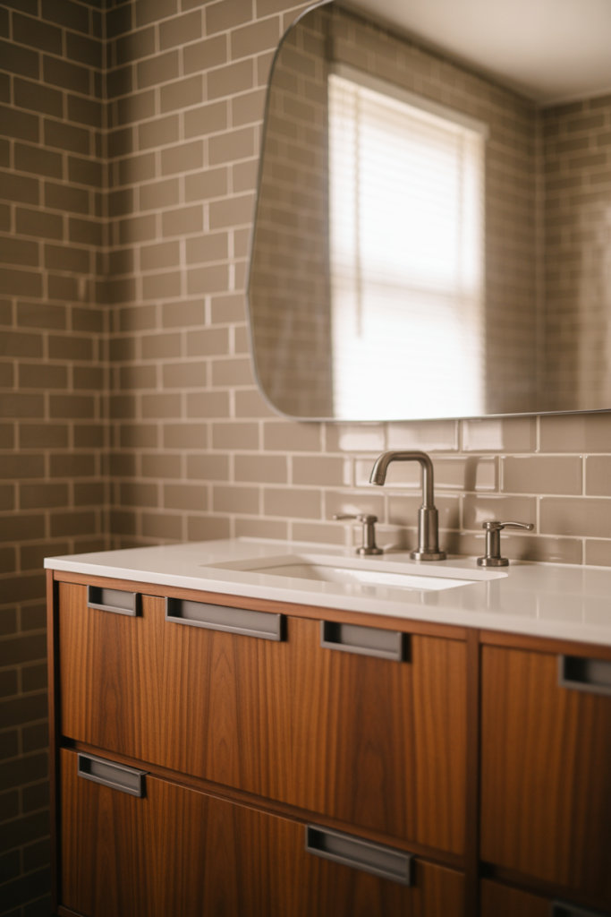 The influence of Mid century design returns in a quieter, more refined way for modern bathrooms. Warm wood tones meet crisp tile, while subtle Contemporary lines keep the look fresh. This style bridges old and new, offering nostalgia without feeling dated and structure without losing warmth.