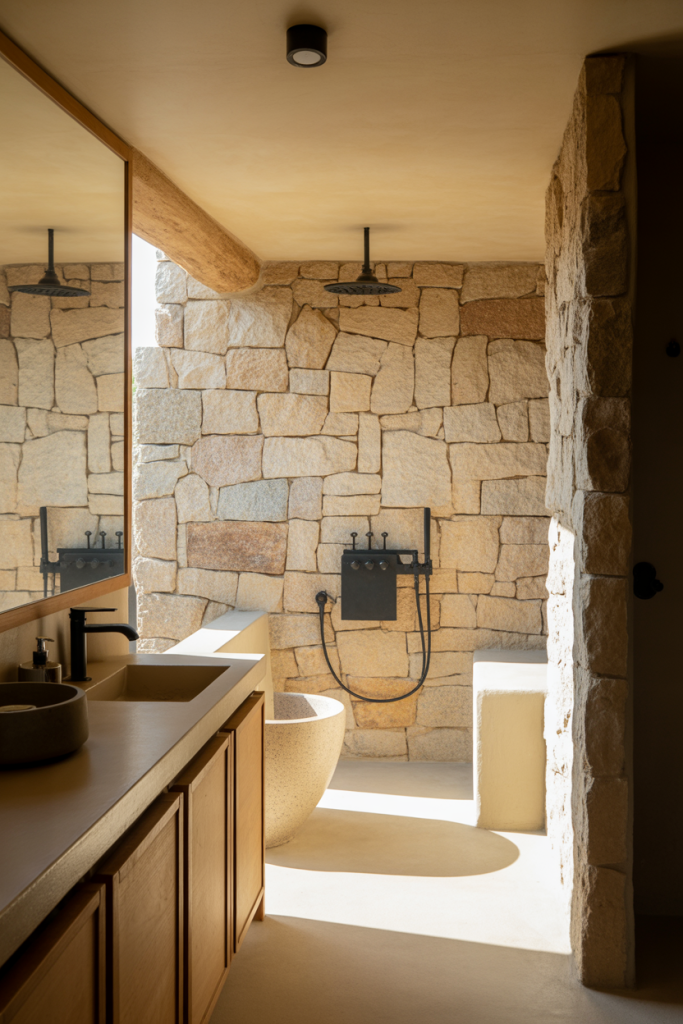 Rustic elements are being reimagined through a modern lens, blending Rustic textures with Earthy palettes and clean geometry. Natural stone, wood grain, and soft plaster finishes bring warmth, while modern fixtures prevent the space from feeling heavy or overly traditional.