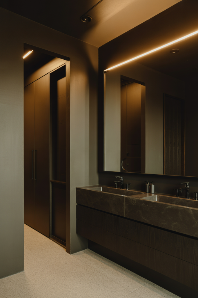 Dark bathrooms are no longer intimidating when balanced correctly. Using Dark tones alongside modern lighting and reflective surfaces transforms the Bath into a bold yet inviting space. The mood feels intimate, not closed off.