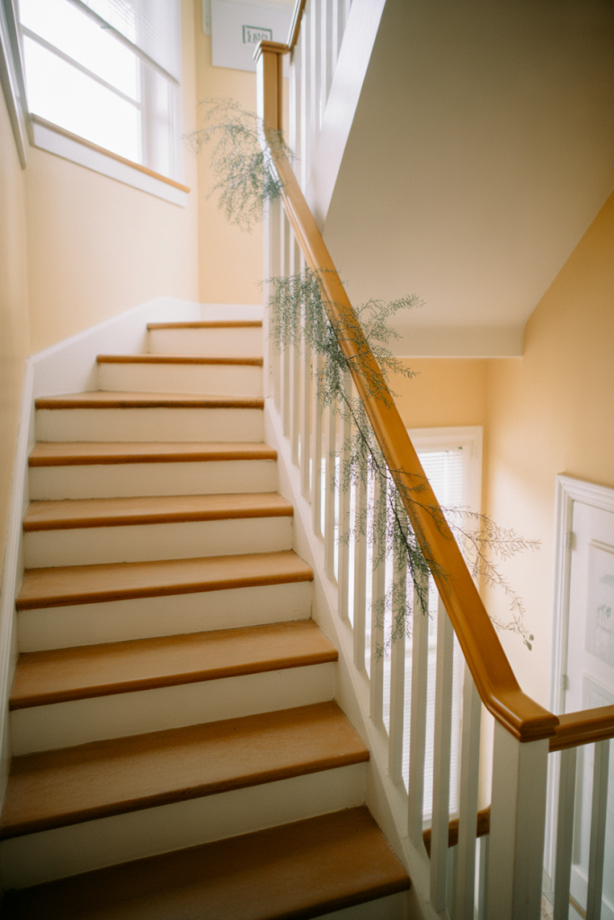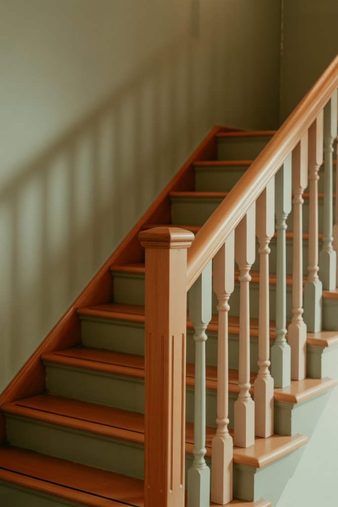 This mixed finish pairs natural tones with creative color, making the staircase feel intentional and lively. The contrast of Wooden grain against softly Painted spindles adds subtle personality without complicating upkeep. It’s an approachable way to refresh traditional spaces.