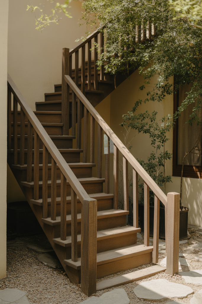 American lifestyle context: Many rural and suburban homes use split-rail accents to tie outdoor structures together—fences, decks, porches. Extending that language to stairs creates a cohesive visual story.