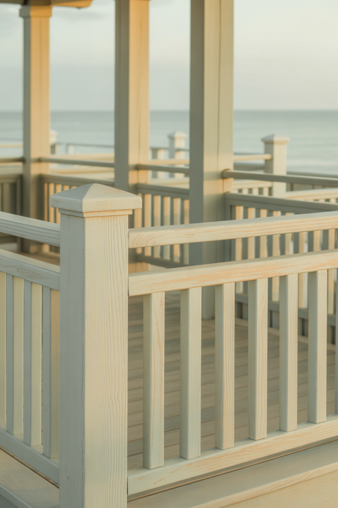This breezy design pairs light neutrals with subtle textures to echo relaxed seaside living. It suits porches, patios, and upper decks, especially when accented with Outside lighting or pale tones reminiscent of Coastal homes. Soft lines and simple geometry help the railing blend into its surroundings.