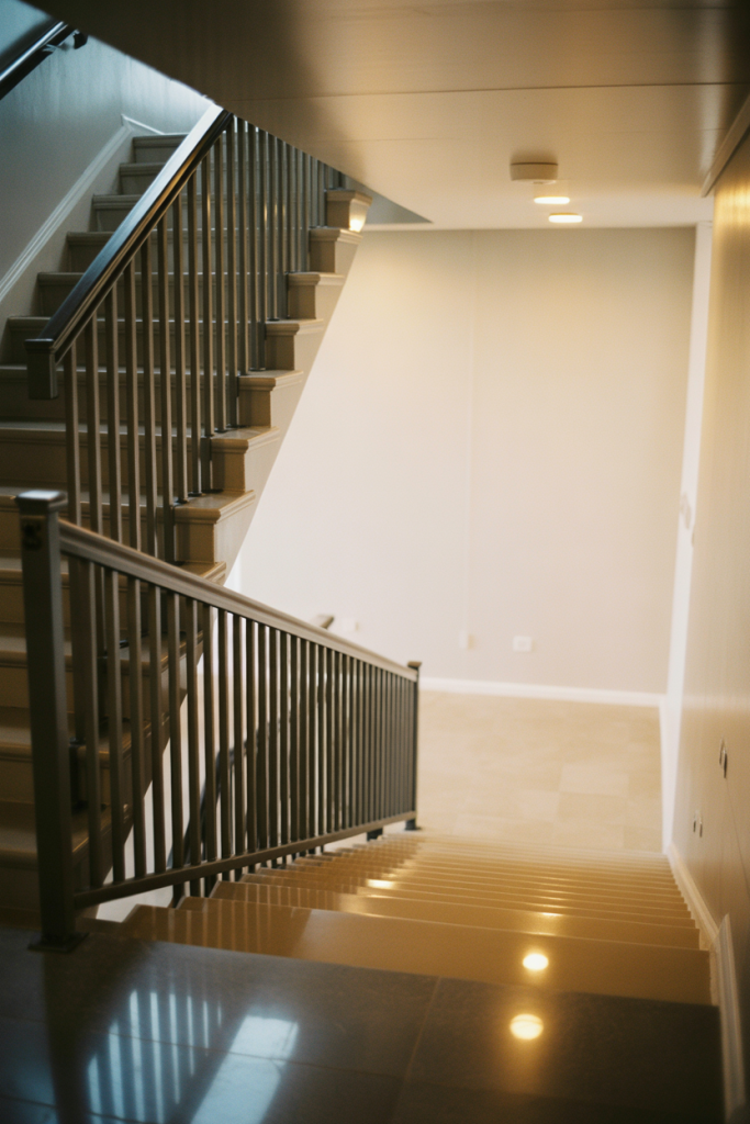 Where it works best: finished basements used as home theaters, workout spaces, or guest suites. Sleek rails add clarity to transitional zones and help visually organize areas that otherwise feel tucked away or disconnected from the rest of the home.