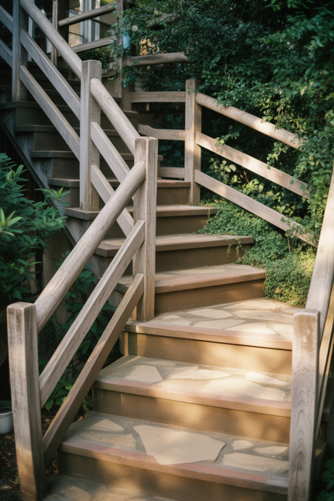 American lifestyle context: Many rural and suburban homes use split-rail accents to tie outdoor structures together—fences, decks, porches. Extending that language to stairs creates a cohesive visual story.