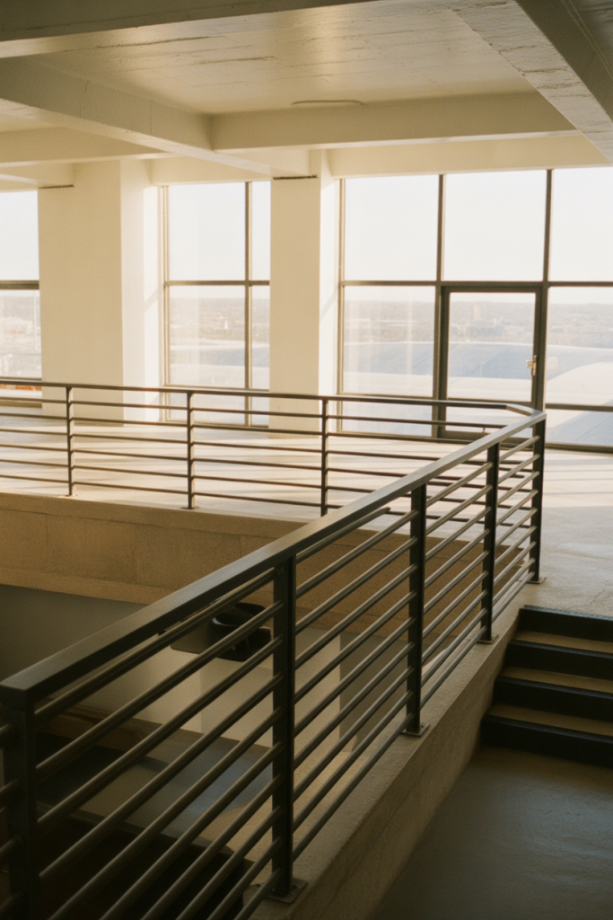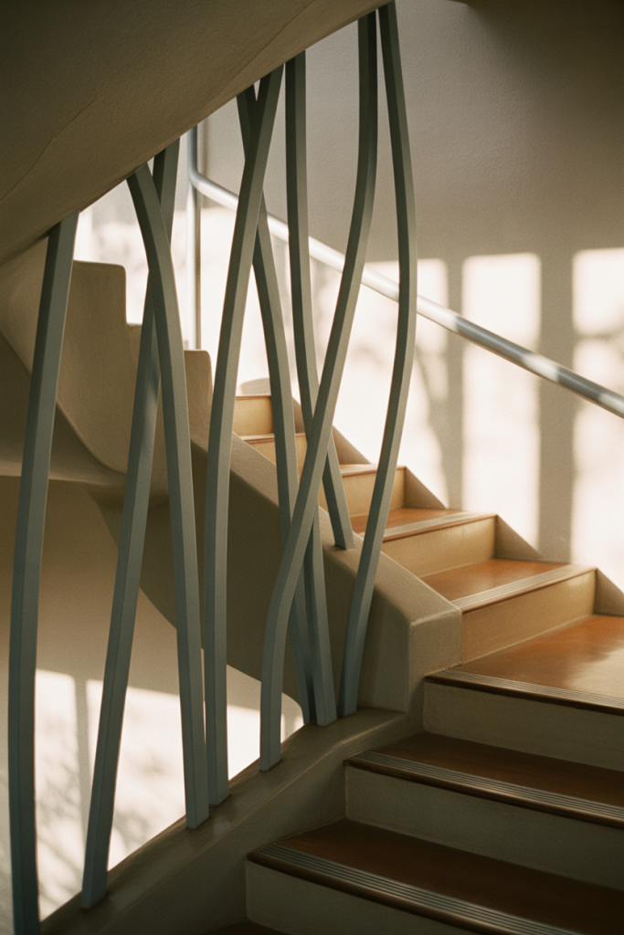 This expressive railing blends sculptural energy with clean structure. It fits especially well in Contemporary spaces, where bold geometry and Metal balusters create eye-catching rhythm. Artistic detailing adds personality without disrupting overall balance, making it both functional and decorative.