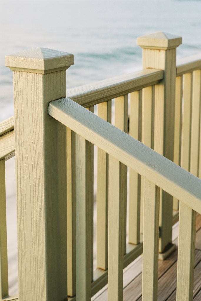 This breezy design pairs light neutrals with subtle textures to echo relaxed seaside living. It suits porches, patios, and upper decks, especially when accented with Outside lighting or pale tones reminiscent of Coastal homes. Soft lines and simple geometry help the railing blend into its surroundings.