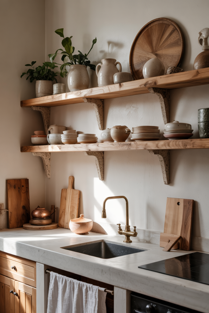 The Wabi Sabi philosophy extends into kitchens, where handcrafted ceramics, raw stone counters, and open shelving replace sterile finishes. Imperfection becomes elegance, and every object tells a story. It’s an ideal concept for tiny homes that celebrate simplicity and presence.