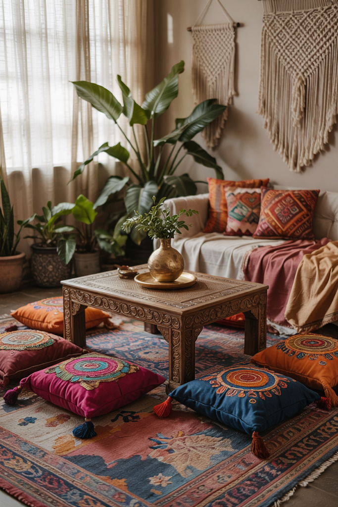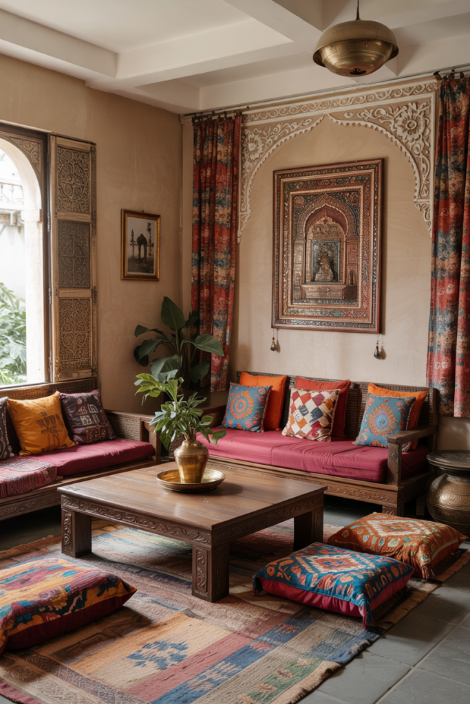 Blending Indian artistry with boho comfort, this 2026 trend celebrates vibrant textiles, low seating, and handcrafted decor. Patterned pillows and wooden accents create an inviting aesthetic full of global charm. It’s perfect for apartments craving warmth and personality.