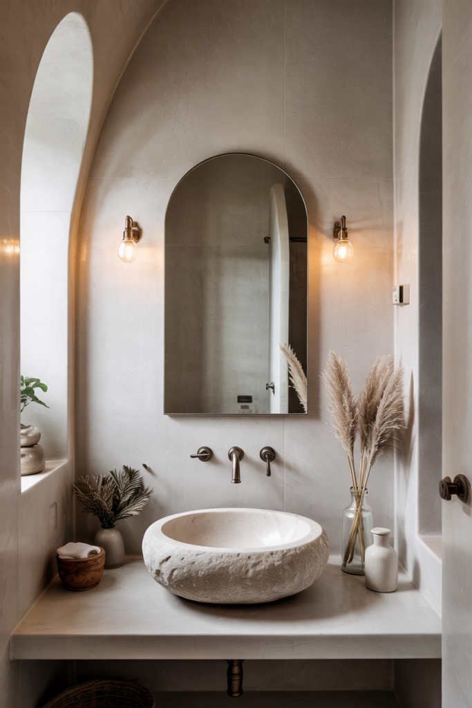 Luxury in 2026 Is Calm, Not Flashy. Spa-like bathrooms now embrace Wabi Sabi restraint — stone basins, matte finishes, and subtle medditeranean style arches. Add plants and diffused light for serenity that feels both modern and timeless.