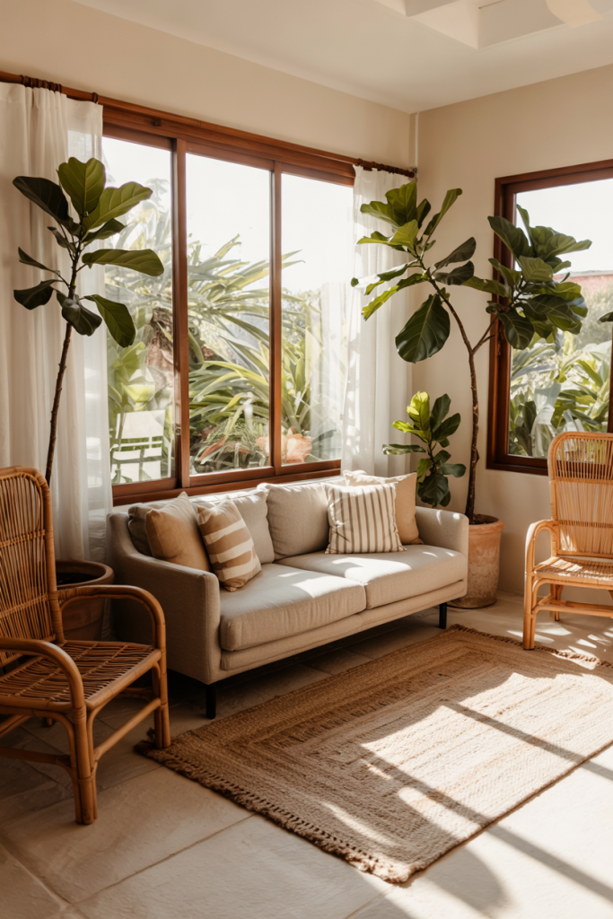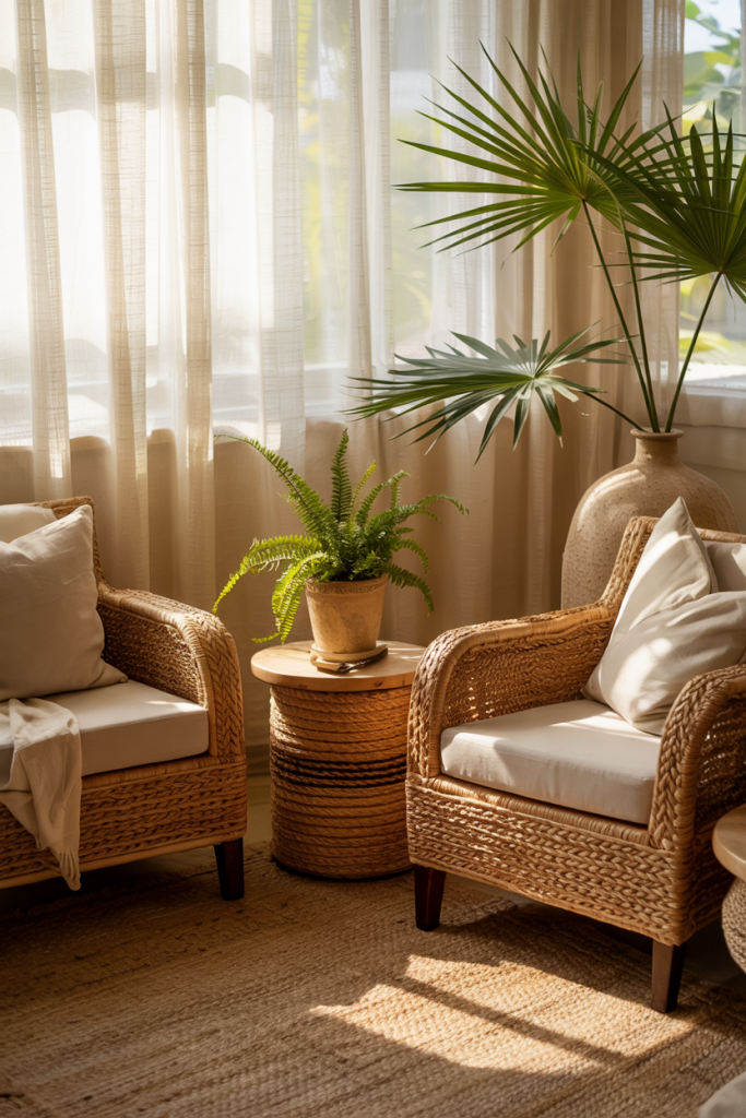 Value element — budget angle: rustic–tropical fusion is characterized by the use of economical materials such as jute, rattan, and reclaimed wood, aiding the homeowner in the achievement of a layered style without significant expense.