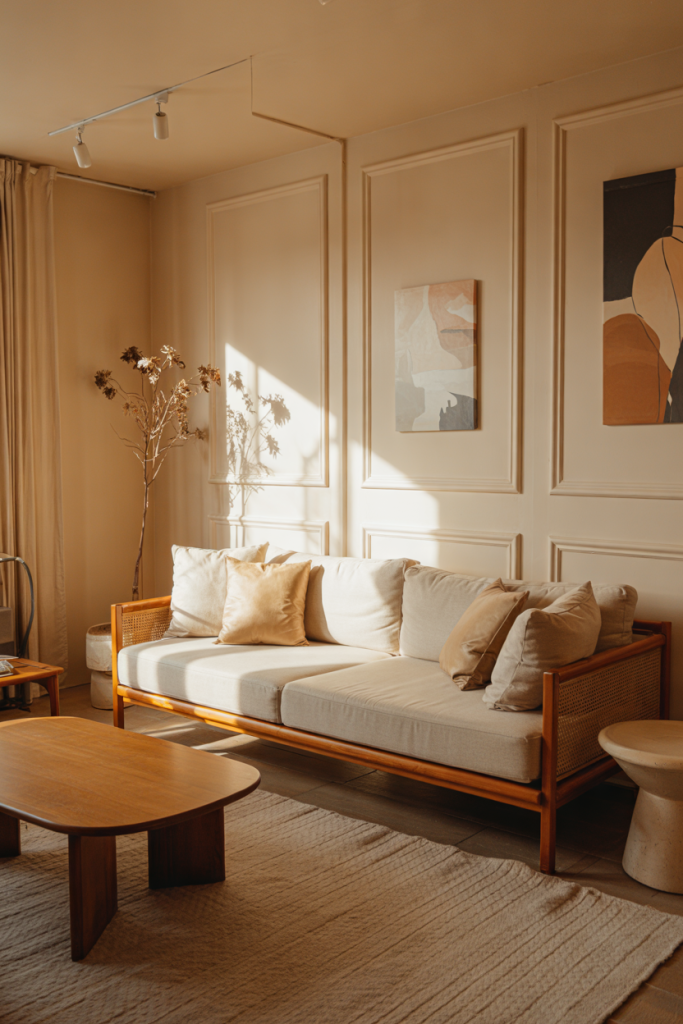 Japandi blends Scandinavian ease with Japanese restraint, creating harmony in open-plan homes. A muted palette paired with Japandi details and smooth Wooden surfaces sets the tone. Soft curves and natural fibers help the living room feel lived-in, centered, and grounded.
