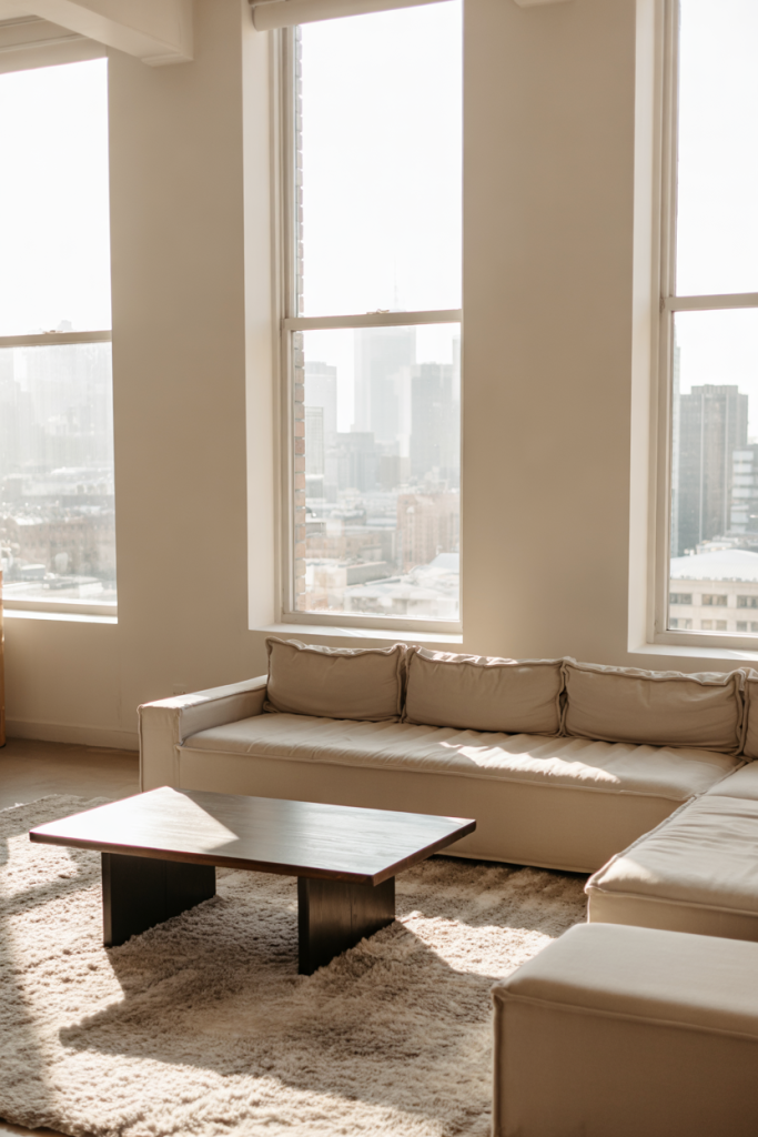 Lofts relying minimally on decor benefit from lower cost items as they decorate with textures, layering and light. One good sofa and a durable rug is a good investment as it frames the space without needing decorative skill. They