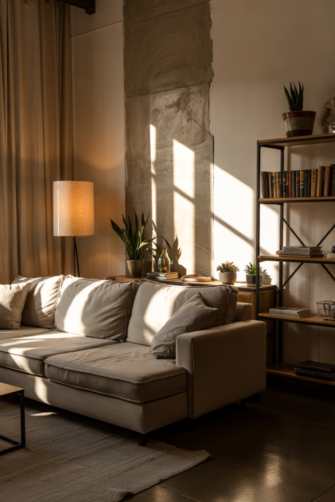 A modern industrial living room doesn’t need to feel cold. Mixing softened fabrics with architectural materials—especially touches of raw Concrete alongside Industrial accents—creates a room that feels intentional yet welcoming. The contrast brings texture and depth without sacrificing comfort.