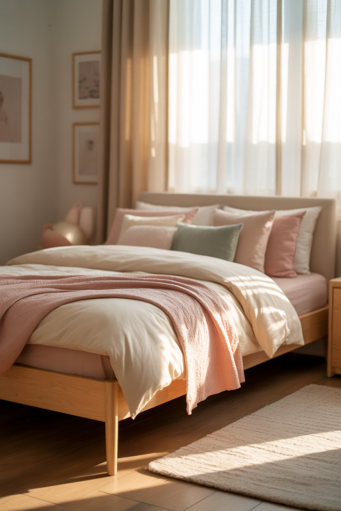 This look focuses on gentle color layers, textured fabrics, and calm visual flow. Among teen girl bedroom ideas aesthetic, it stands out for feeling personal without being overwhelming. Think muted pastels, light wood furniture, and simple decor details that can change easily over time. The goal is a bedroom that feels collected, not decorated all at once, allowing personality to show through small, meaningful accents.