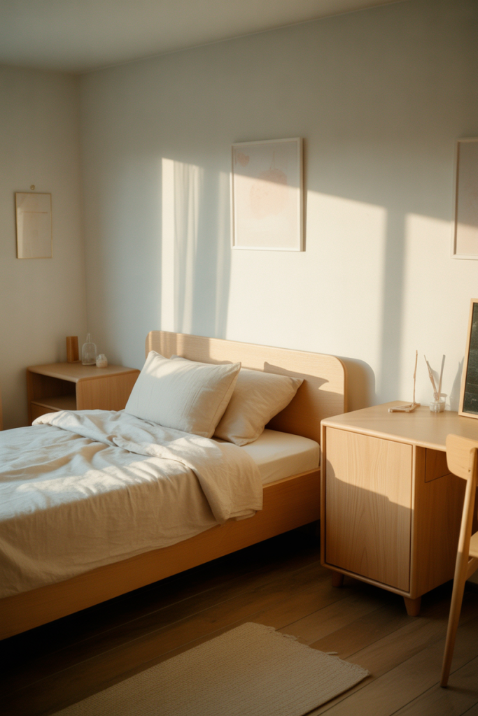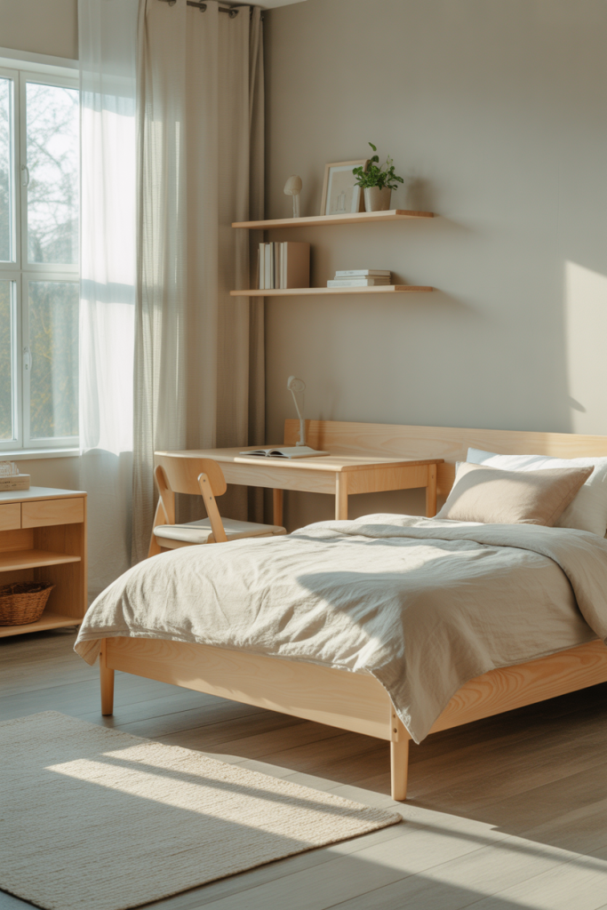 Modern teen girl bedroom with clean lines, neutral color palette, simple desk setup, minimal decor, organized shelves, bright natural light, calm and focused mood.Real homeowner behavior shows parents appreciate this style because it’s easy to maintain. Fewer decorative items mean less cleaning and quicker resets, which supports daily routines without constant reminders to tidy up.