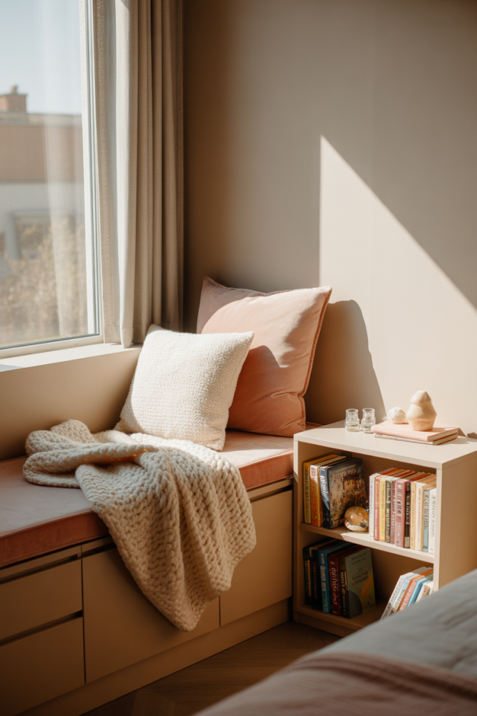 This setup works best in bedrooms with a window alcove or unused corner. Placing the nook near natural light reduces eye strain and makes the space feel intentional rather than improvised. Even small rooms can benefit when seating is integrated into existing architecture.