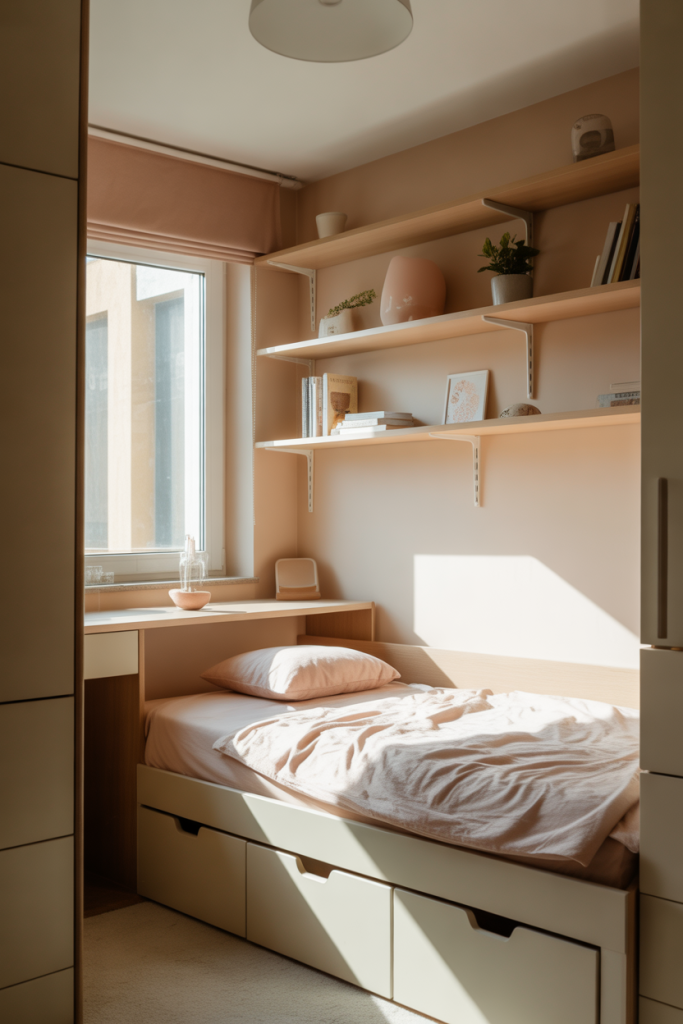 Teen girl bedroom ideas small room are all about smart choices that don’t feel cramped. This concept uses multifunctional furniture, vertical shelving, and thoughtful decorating ideas to maximize space. The room still feels open and stylish, but every piece serves a purpose, from storage beds to wall-mounted desks.