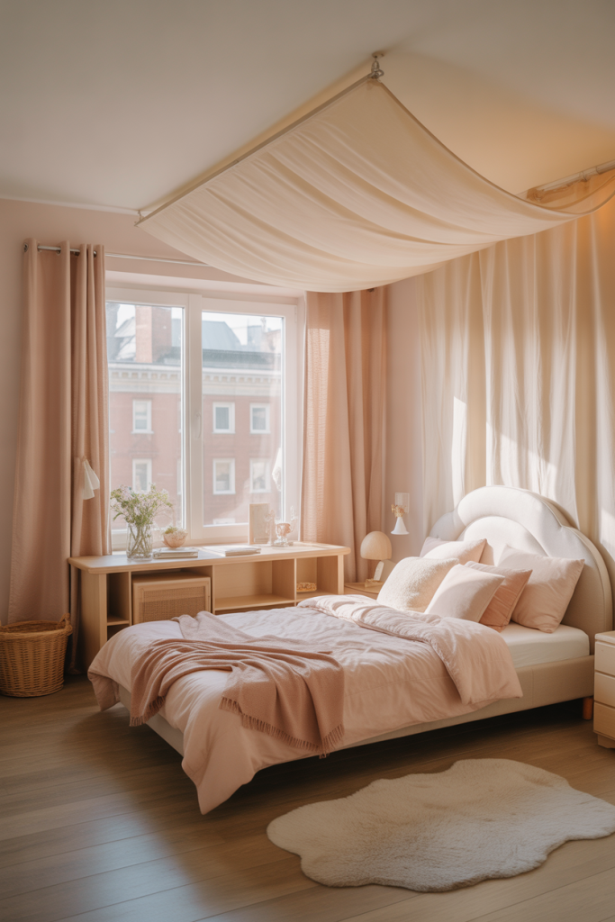 Romantic styling brings gentle charm to teen girl bedroom inspirations. Flowing fabrics, curved furniture, and delicate decor ideas create a dreamy atmosphere without leaning into clichés. The space feels soft, calm, and expressive.