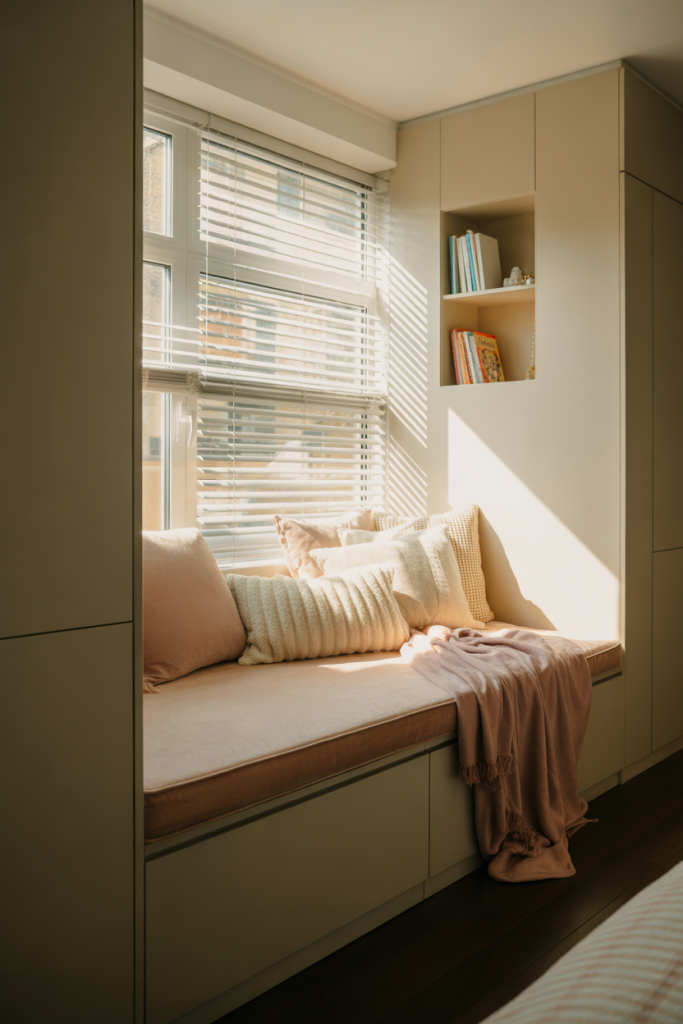 This setup works best in bedrooms with a window alcove or unused corner. Placing the nook near natural light reduces eye strain and makes the space feel intentional rather than improvised. Even small rooms can benefit when seating is integrated into existing architecture.
