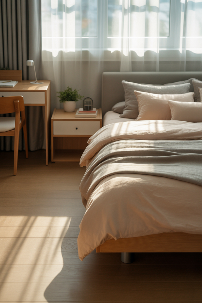 Where it works best is in homes with open layouts or shared bedrooms. Neutral palettes visually expand the space and reduce sensory overload, which helps maintain calm in busy households.