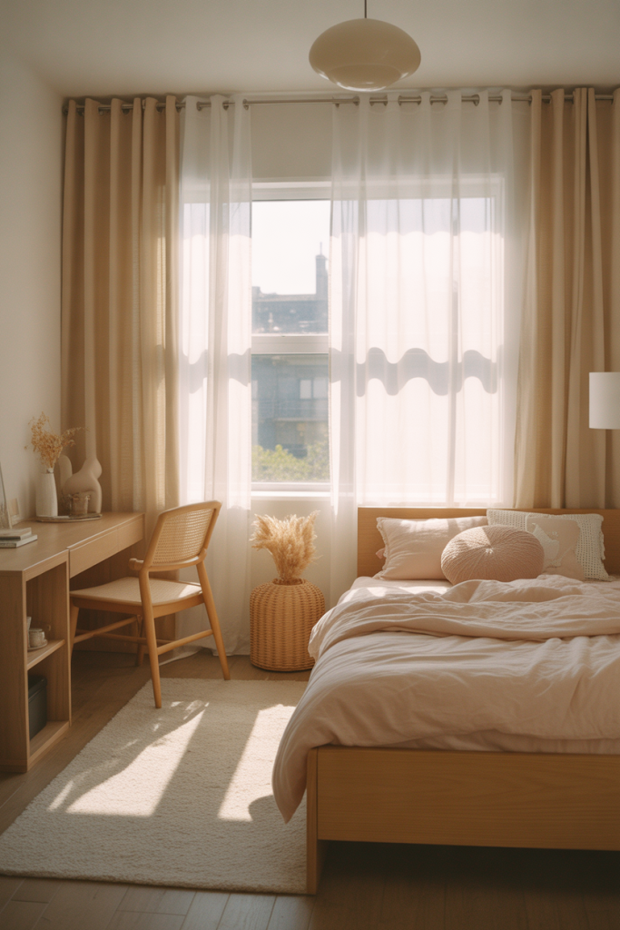 This idea highlights how light alone can transform teen girl bedroom ideas aesthetic. Sheer curtains, pale walls, and restrained decor let daylight become the main design feature. The room feels open, calm, and emotionally lighter, which is especially appealing in 2026 when teens value spaces that help them reset after busy days.
