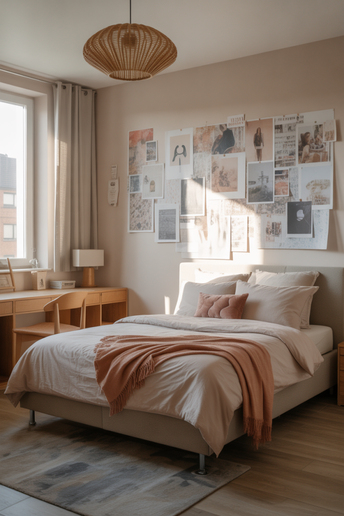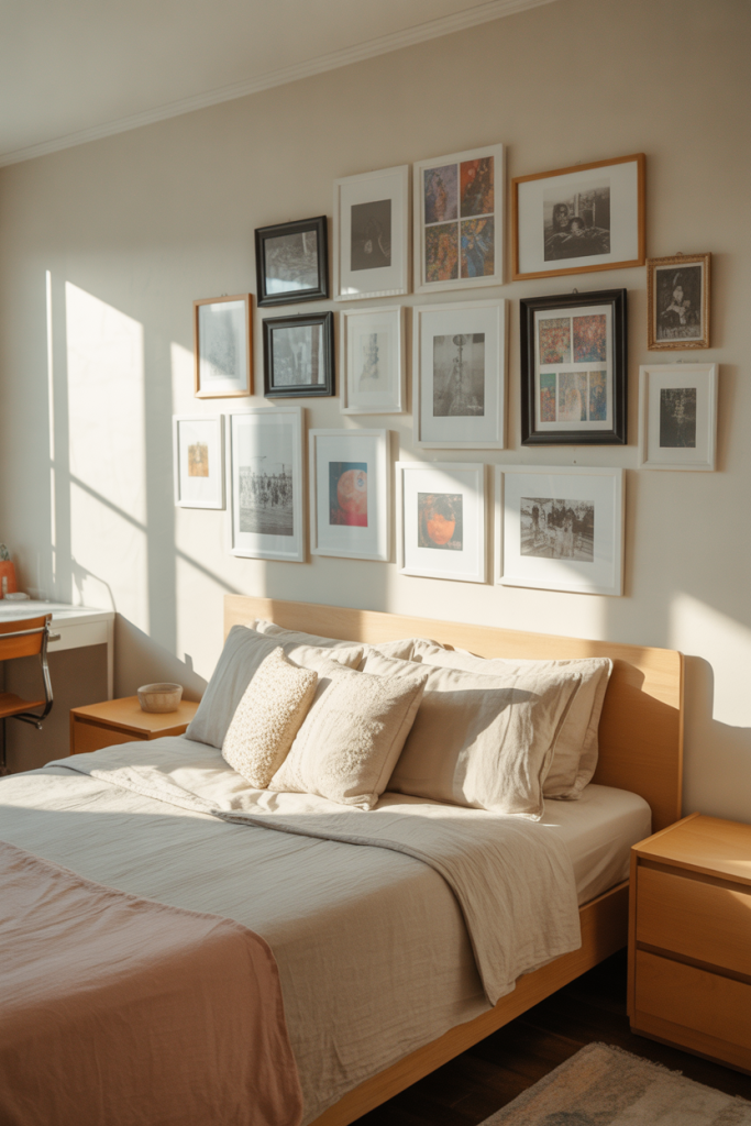 This bedroom idea leans into self-expression through art and layout. Popular among teen girl bedroom designs, gallery walls allow teens to showcase photos, prints, and personal artwork. Paired with simple decor, the wall becomes the focal point while the rest of the room stays clean and balanced.