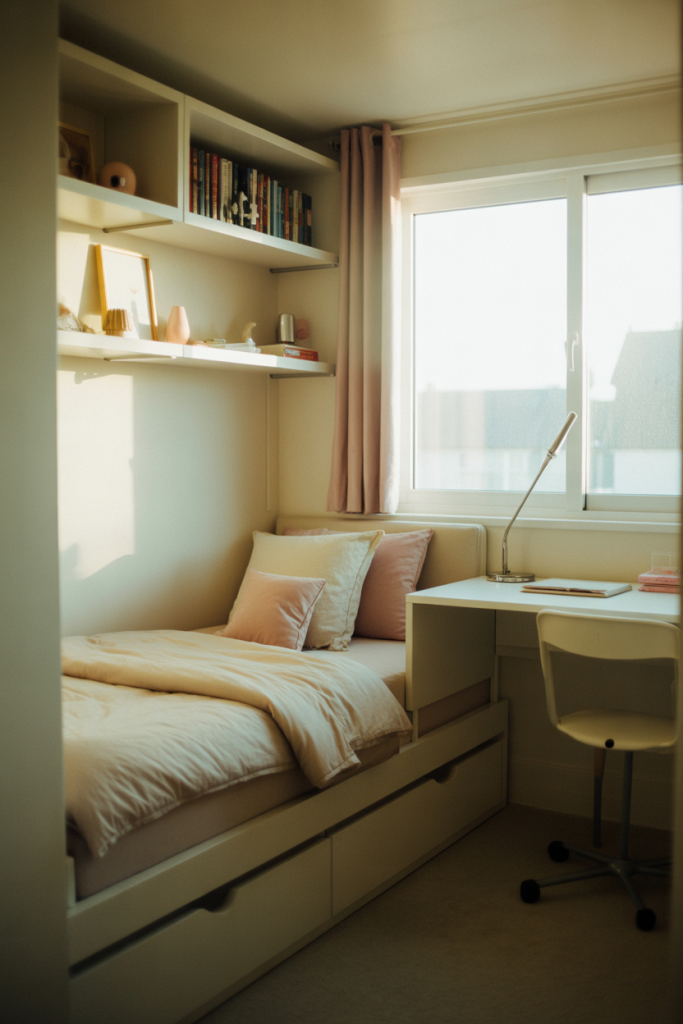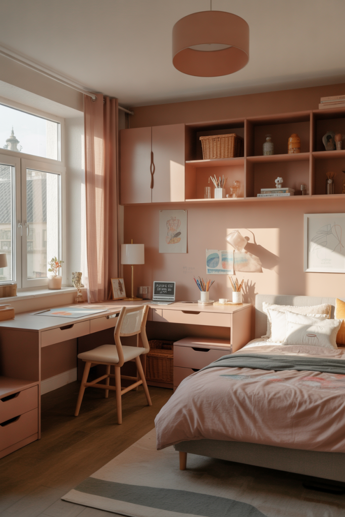 Teen girl bedroom ideas small room are all about smart choices that don’t feel cramped. This concept uses multifunctional furniture, vertical shelving, and thoughtful decorating ideas to maximize space. The room still feels open and stylish, but every piece serves a purpose, from storage beds to wall-mounted desks.