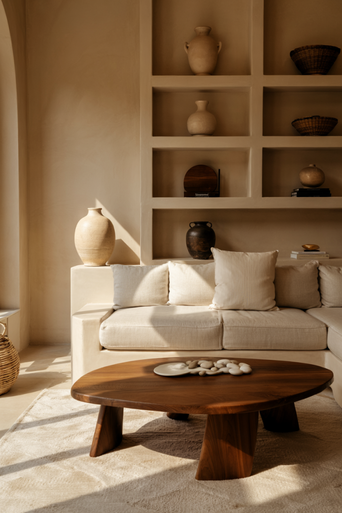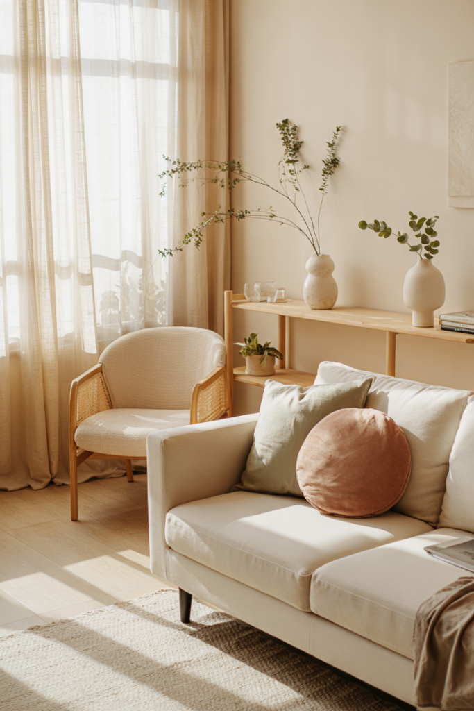 This living room pairs soft Scandinavian geometry with subtle retro accents, creating a moody yet inviting atmosphere. Layered neutrals combine with warm woods, while hints of moody tonal depth add nuance. A touch of Japan-inspired simplicity keeps the space from feeling overly eclectic.