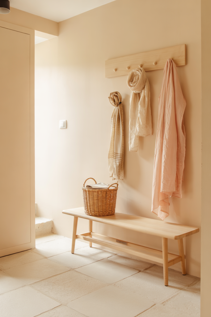 Where it works best: this idea shines in homes with narrow hallways, as the restrained palette visually widens the space while still making the entrance feel intentionally styled and functional.