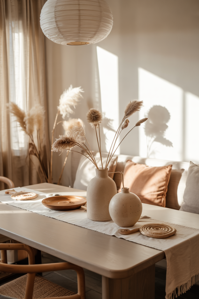 This dining setup leans into muted tones and a grounded pastel base. Light woods, clean silhouettes, and a hint of Japanese restraint shape an atmosphere that feels spacious and bright. A sprinkling of design ideas—like rounded chairs or textured linens—keeps the look fresh and quietly expressive.