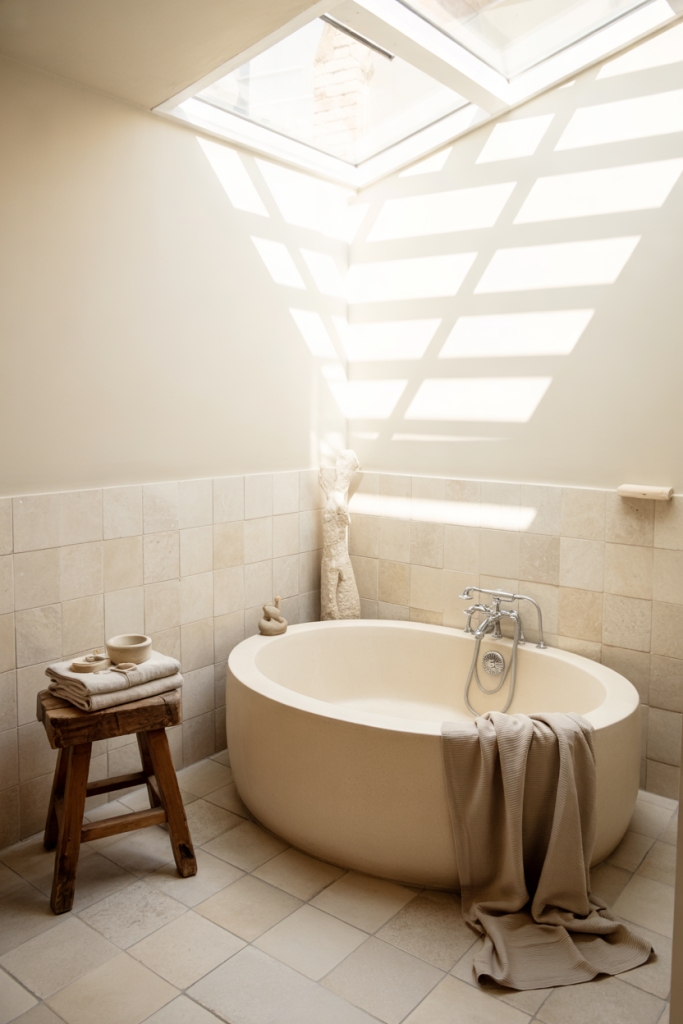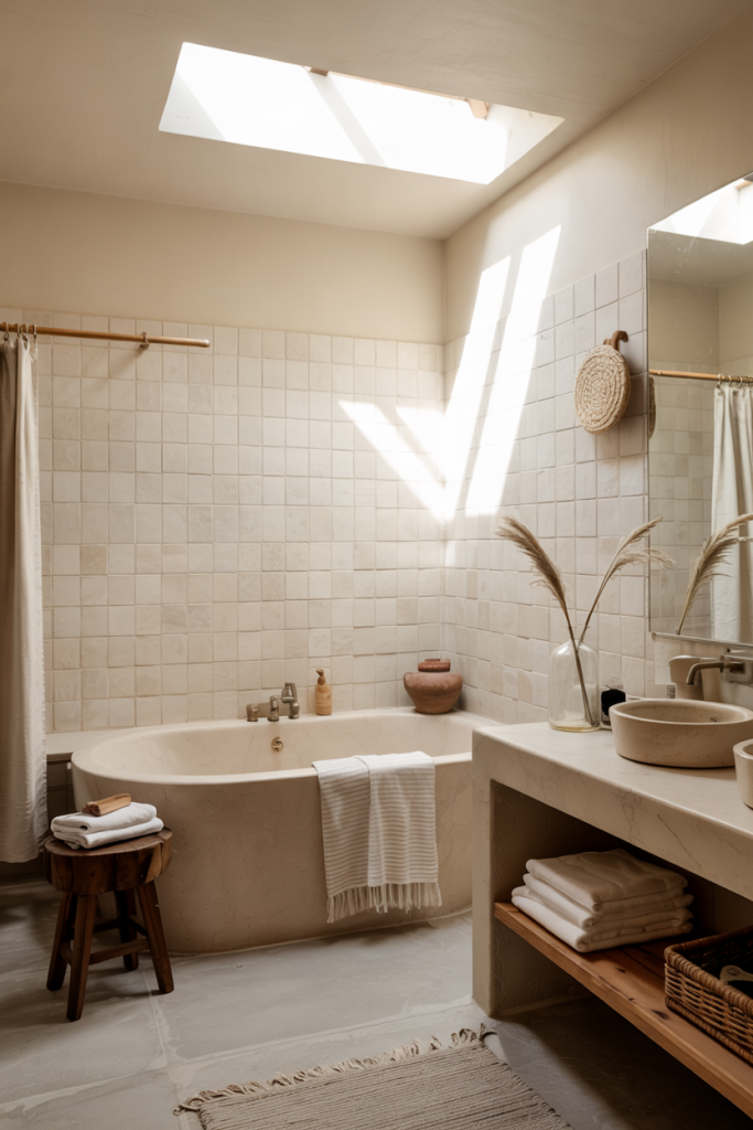 This bath retreat blends airy Nordic simplicity with subtle Japandi grounding. Calm stone, soft woods, and a neutral base create a getaway-like feeling. Adding touches of Japan-inspired shapes and a hint of bathroom spa texture keeps the vibe serene and cohesive from floor to ceiling.