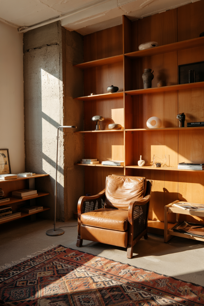 This idea blends Nordic softness with urban grit through subtle industrial accents. Smooth oak, matte finishes, and understated lighting keep the look warm, while nods to retro textures add interest. A touch of design living room styling pulls the space together without overwhelming it.