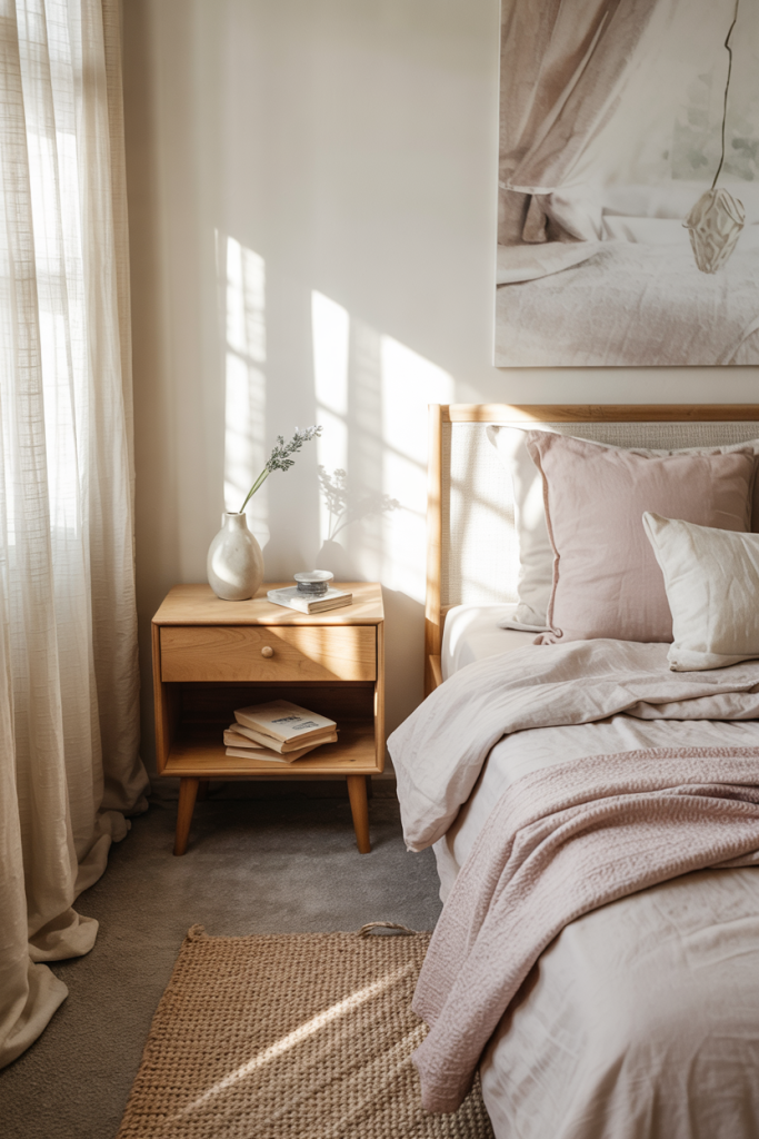This bedroom softens Nordic structure with airy pastel touches and subtle midcentury curves. Clean shapes and grounded wood tones stabilize the palette, while hints of bedroom design styling keep it elevated. The result is bright, gentle, and perfectly restful.