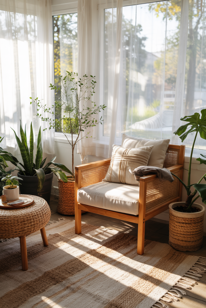 This sunroom idea embraces warm textures and a natural flow, giving space to unwind. Soft textiles create a cozy foundation, while airy plants keep the mood elevated. Muted tones, subtle curves, and touches of Nordic living room influence refine the visual balance. A hint of moody depth adds contrast.