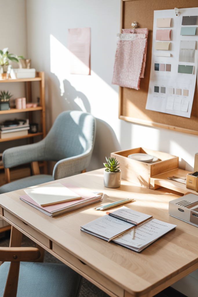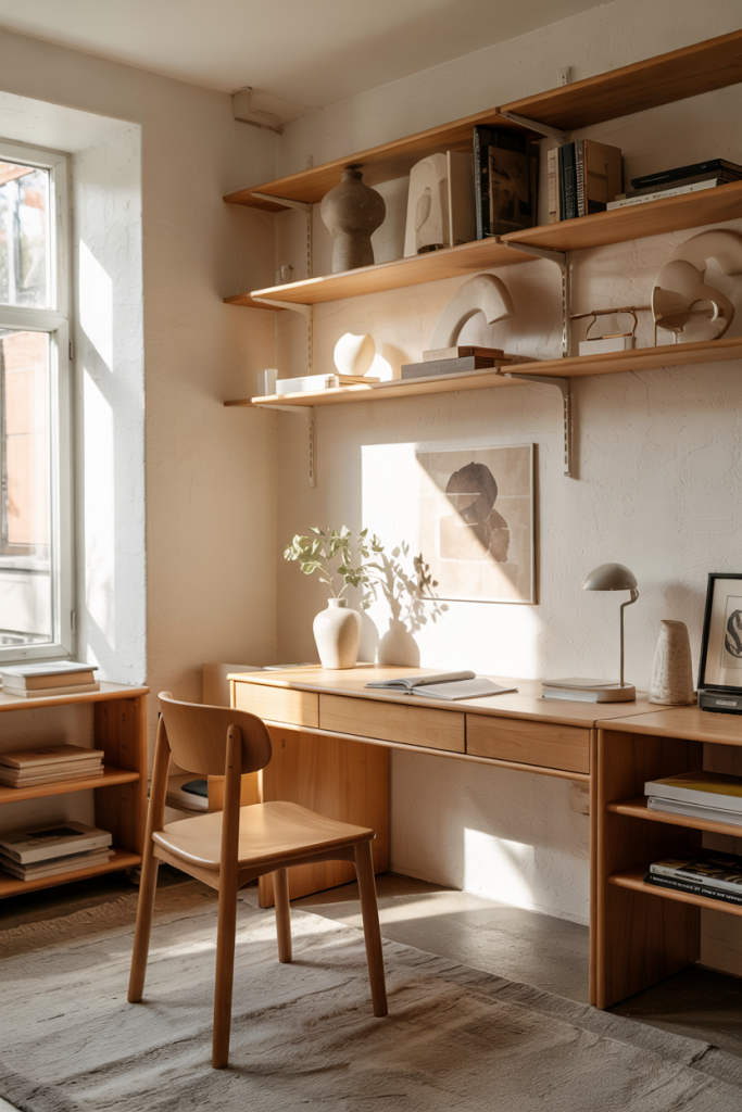 This workspace highlights minimal organization, clean lines, and breathable surfaces. Soft wood, refined storage, and a calm color palette create a sense of clarity. A touch of design ideas—like a sculptural chair or understated lamp—keeps the setup visually inspiring without distraction.