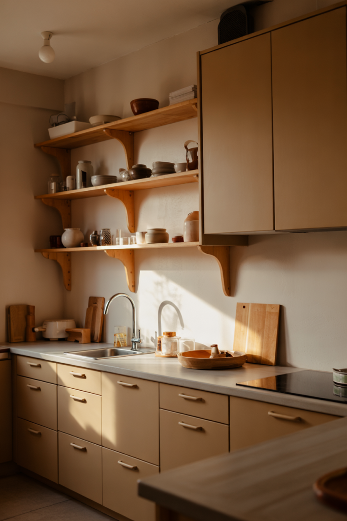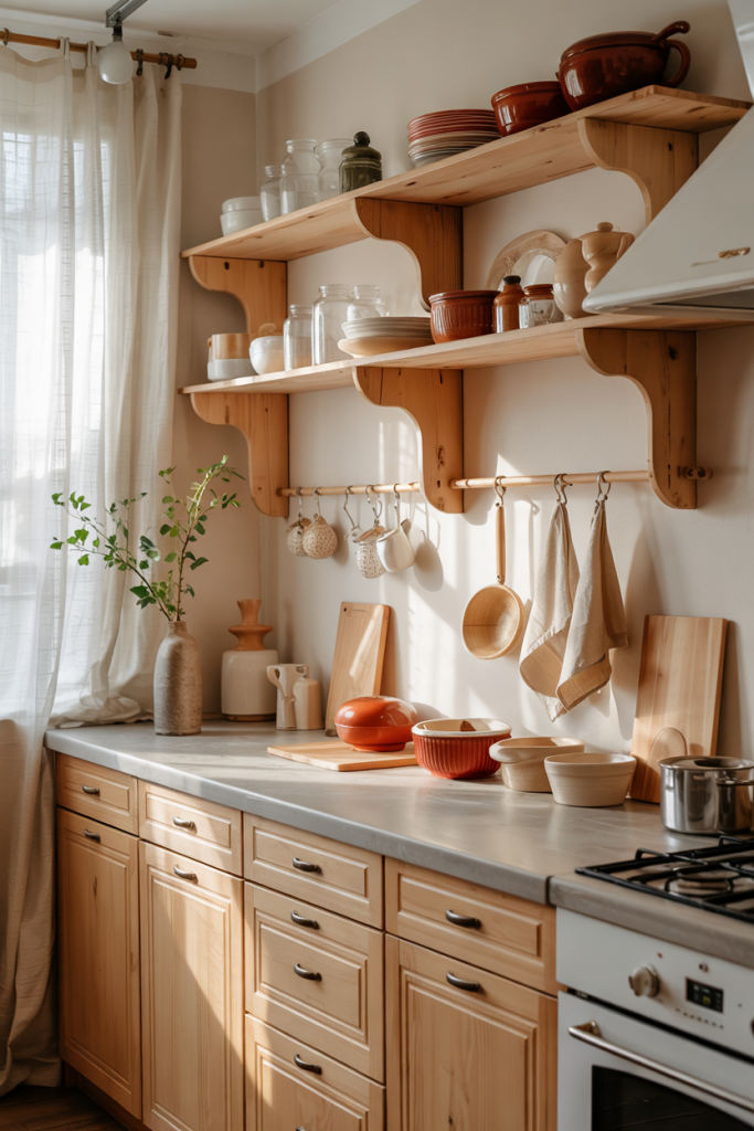 This kitchen idea brings gentle brightness into a Nordic framework by adding small pops of colorful ceramics and fabrics. Soft wood cabinetry and clean edges keep the look calm, while touches of design ideas help the space feel curated. A whisper of Nordic-style warmth makes the room instantly welcoming.