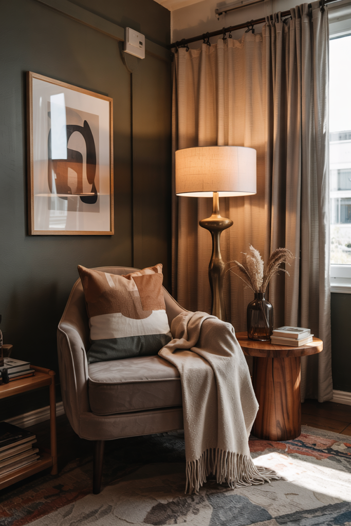 From an expert’s perspective, the key is contrast: balancing darker walls with lighter natural elements keeps the nook from feeling closed in while still achieving the desired moodiness.