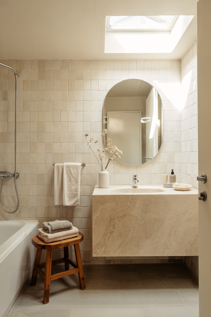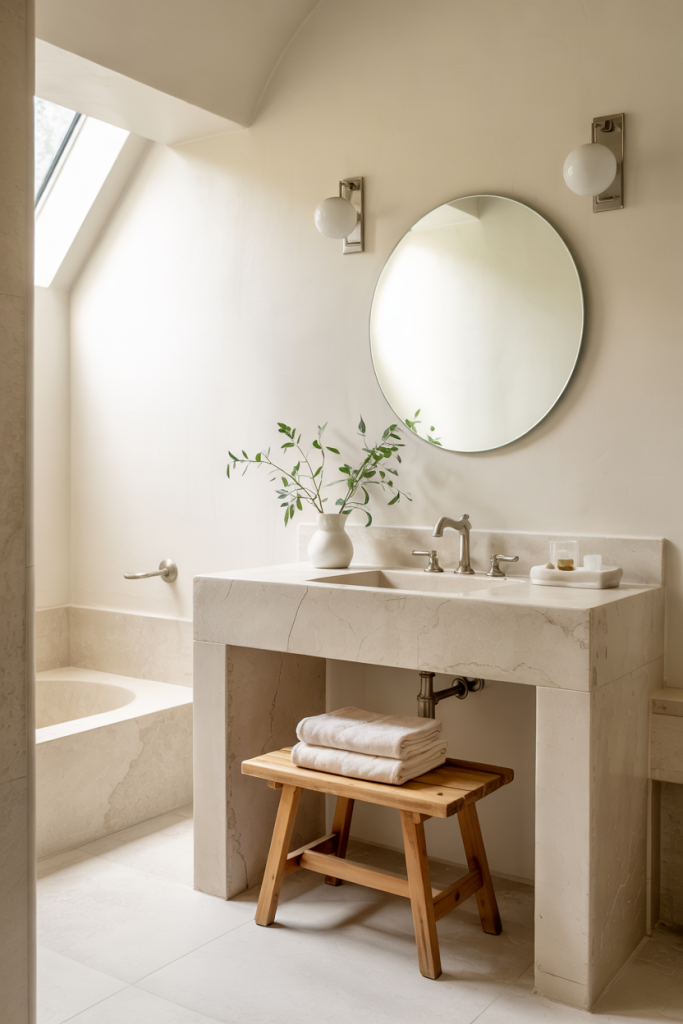 This idea elevates the modern bathroom with warm neutrals, pale stone, and simple lines. Soft textures and a few cozy elements—like woven baskets or cotton towels—help transform even small bathrooms into spa-like escapes. Adding subtle touches inspired by traditional Nordic calm keeps the atmosphere timeless.